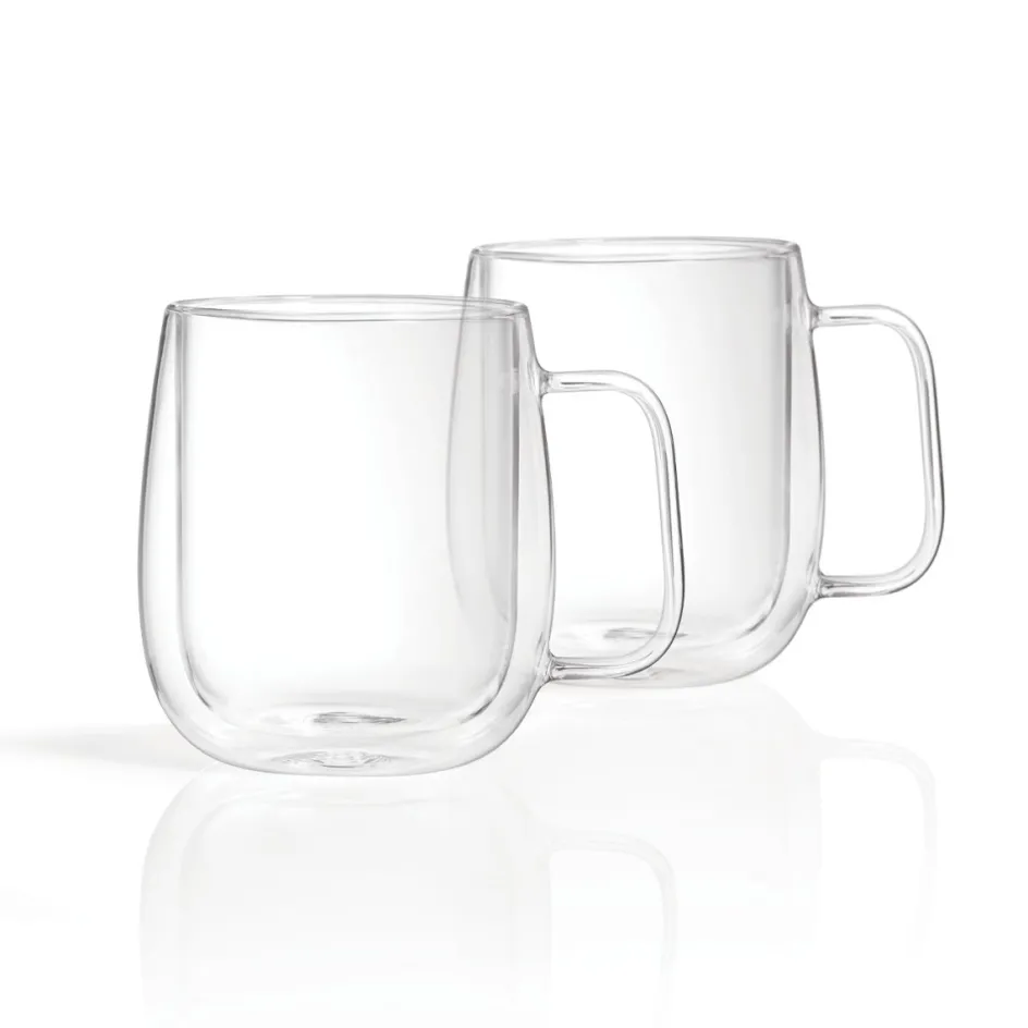 Ces tasses à double paroi avec anse permettent aux boissons froides de conserver leur fraîcheur et aux boissons chaudes de le rester plus longtemps. D’une capacité de 17 oz (500 ml) chacune, elles sont faites de verre borosilicaté, un matériau qui leur confère transparence