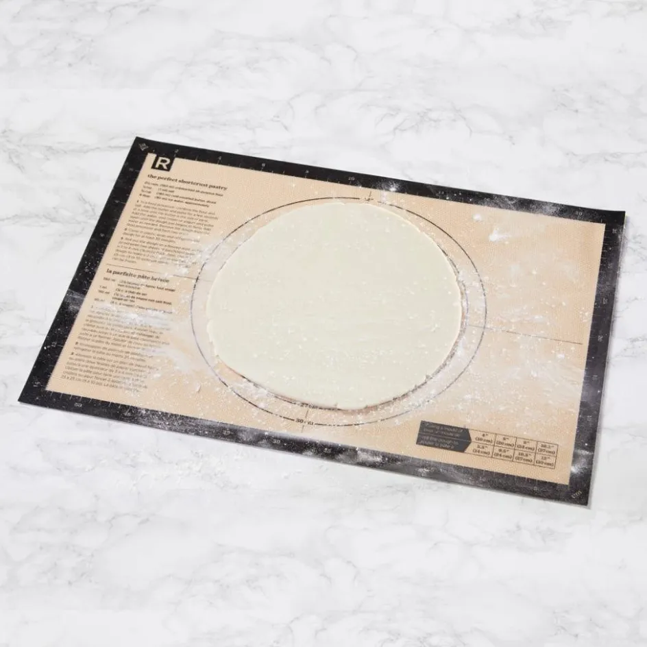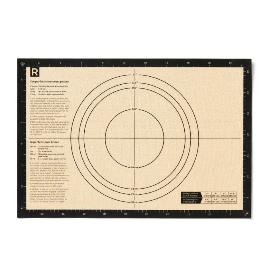 Cette toile antiadhésive est parfaite pour rouler facilement différents gabarits de pâte brisée et de pâte à pizza sans que celles-ci ne collent. Son revêtement antidérapant lui permet de rester bien en place sur les surfaces de travail. Une recette de pâte à tarte de base est même inscrite directement sur la toile.