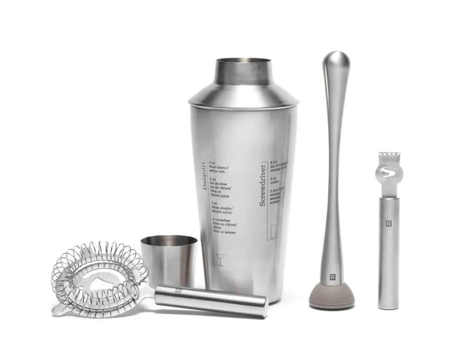 - 5 pièces comprenant : gobelet à mesurer, zesteur à agrumes, pilon, shaker et passoire