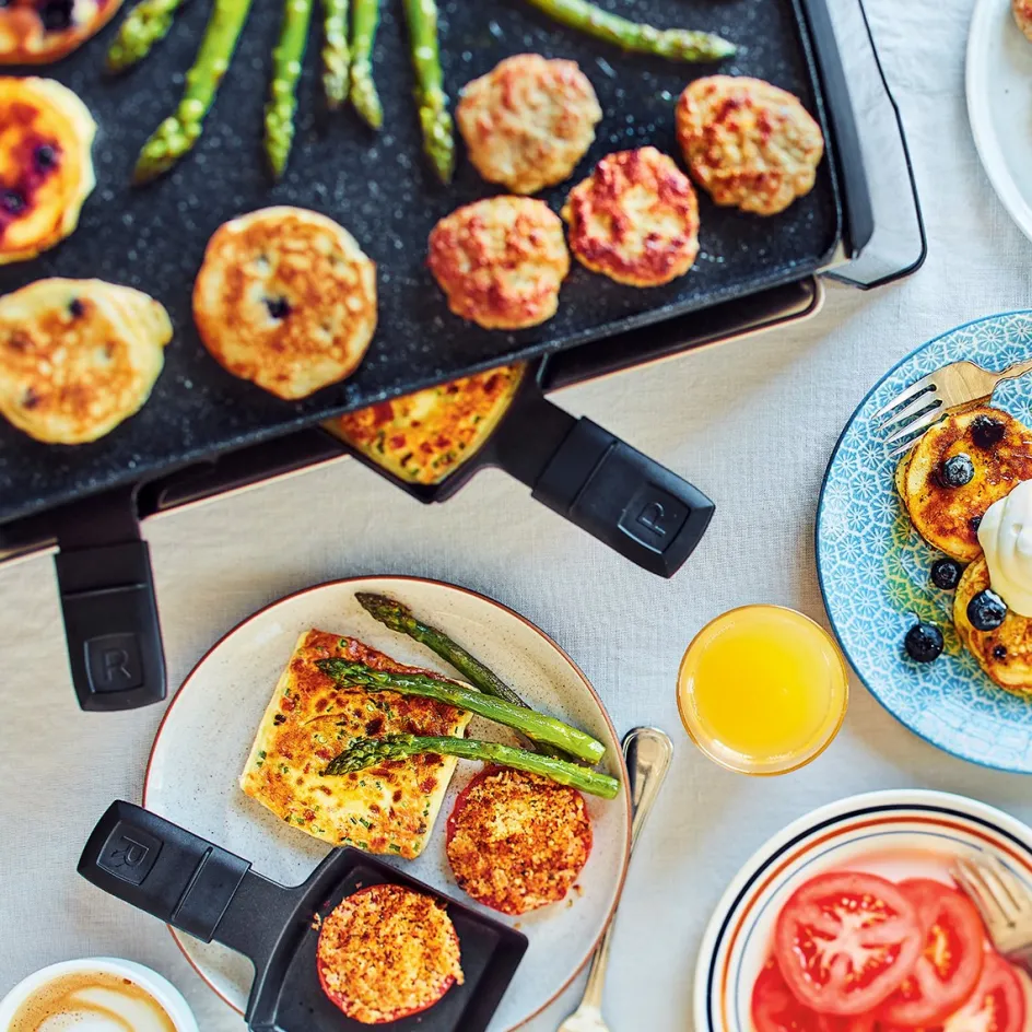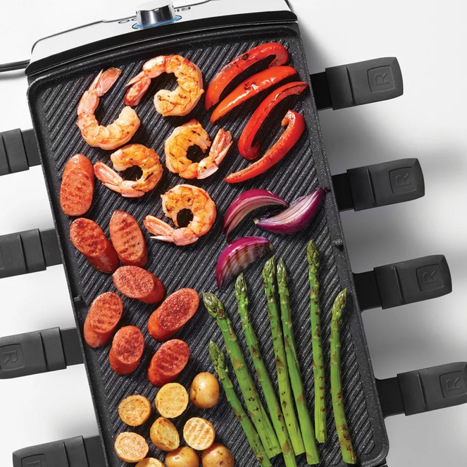 Cette raclette électrique RICARDO est munie d’une grille réversible The Rock ultra-performante. Son côté strié permet à 8 personnes à la fois d’y faire griller leurs viandes, leurs fruits de mer ou leurs légumes favoris, et son côté plat est parfait pour les crêpes et les œufs. Tout comme sa grille, ses 8 poêlons sont antiadhésifs, donc faciles à nettoyer et parfaits pour y faire fondre vos fromages préférés. Une façon simple et rapide de profiter d’un délicieux repas à la bonne franquette entouré de famille et amis!