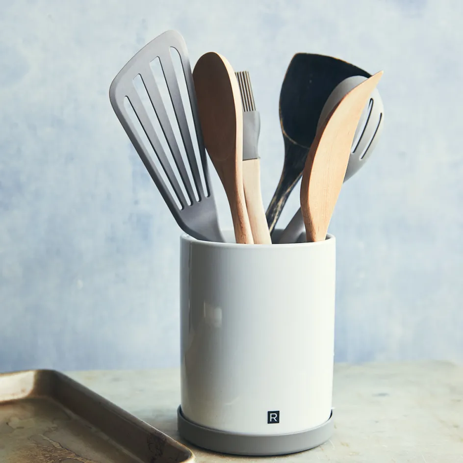 Ce porte-ustensiles rotatif en porcelaine au design chic et épuré permet de garder les ustensiles de préparation à portée de main en tout temps. On aime son système de roulement à billes qui permet de le faire pivoter et ses séparateurs qui maintiennent les ustensiles en place et bien organisés.