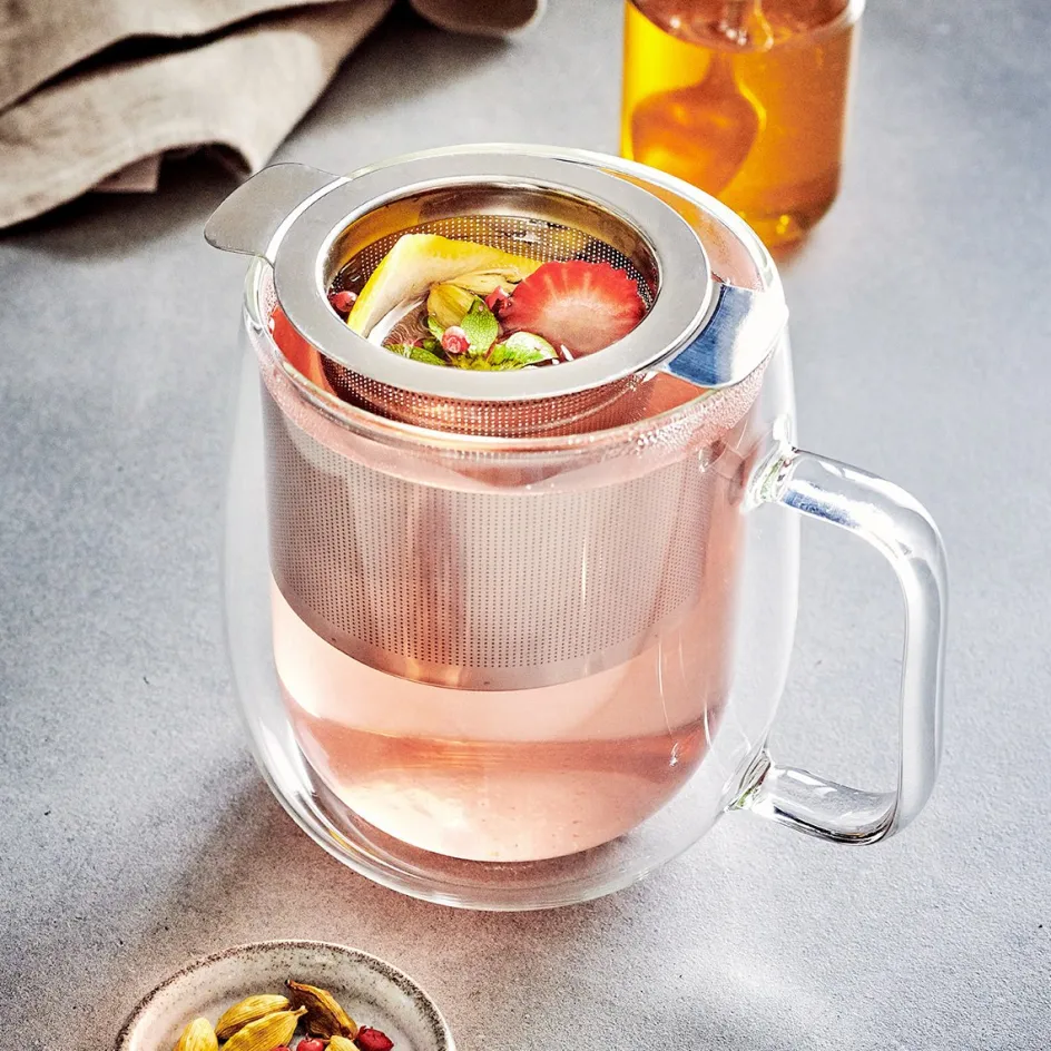 Ces tasses à double paroi avec anse permettent aux boissons froides de conserver leur fraîcheur et aux boissons chaudes de le rester plus longtemps. D’une capacité de 17 oz (500 ml) chacune, elles sont faites de verre borosilicaté, un matériau qui leur confère transparence